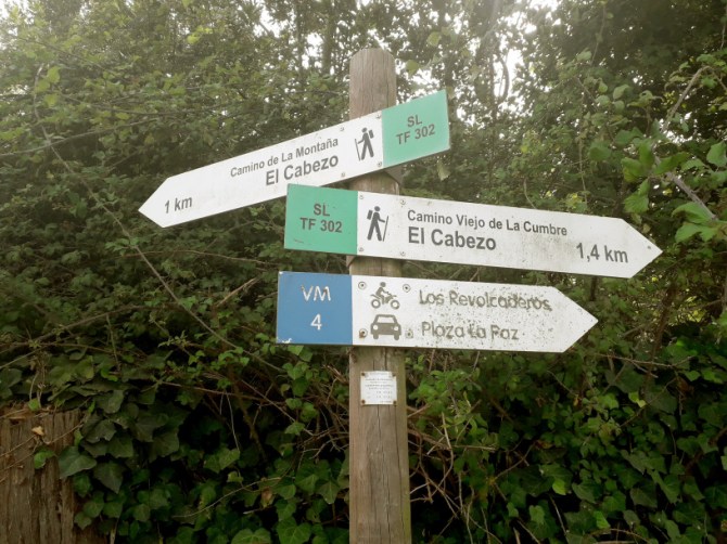 150 m weiter trifft man auf die Pista Las Goteras und geht geradeaus weiter. Diese Gegend ist auch als El Cabezo bekannt, was auf den Wegweiser am Kreisverkehr auch ausgeschildert war. Nun gibt es keine Schwierigkeit mehr, man befindet sich wieder auf dem TF-302. Später geht es etwas steiler abwärts zur befahrbaren Schotterstraße Pista El Rayo. 500 m weiter beginnt beim gelben Haus der Asphalt, und kurz danach kommt man am Kreisverkehr wieder heraus.