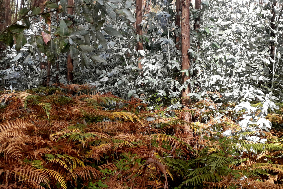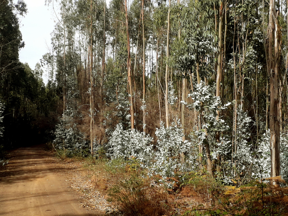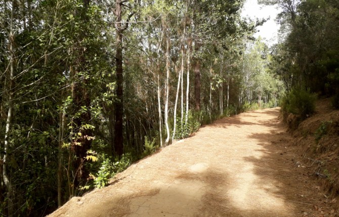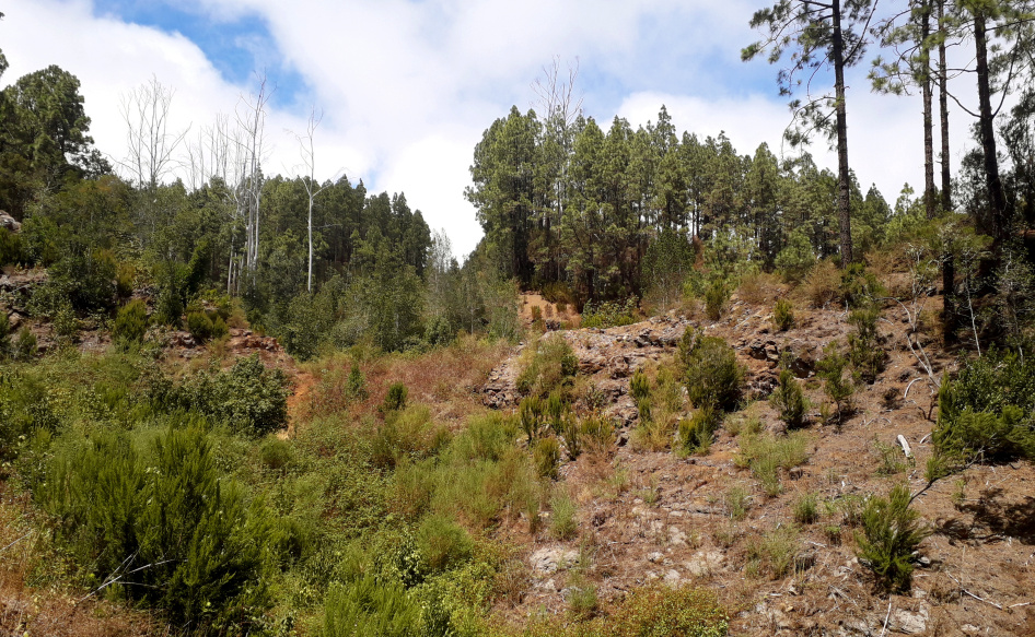 Etwa 100 m nach der Kreuzungsstelle lichtet sich der Wald, und man sieht hinüber zu der Höhe, auf der die Pista Los Gavilanes verläuft. Zu dieser könnte man auch hinauf steigen.
