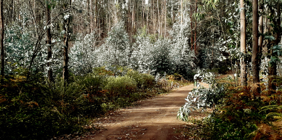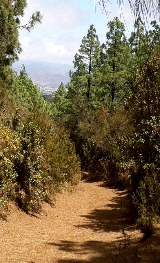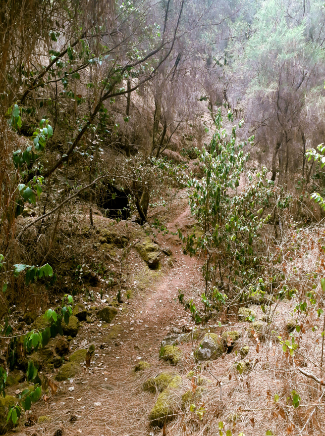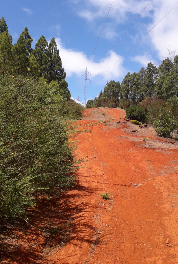 Links am Depot vorbei beginnt die rote Pista Los Gavilanes direkt unter der Hochspannungsleitung. Kurz vorher, gegenüber des Zauns, geht nach links ein Wanderpfad in den Wald hinein, die ersten paar Meter etwas durch Gebüsch und schwer zu sehen, dann aber eindeutig und wunderschön am Hang entlang. Ganz langsam kommt man immer tiefer in den Barranco Los Berros hinein, fast ohne Steigung.