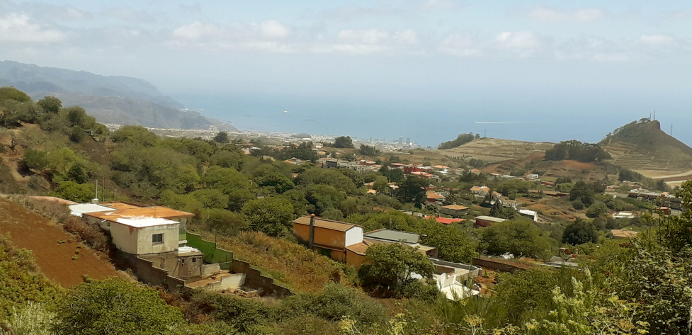 Man geht zunächst in die Calle Las Erillas und kommt nach 150m an der dortigen Grundschule vorbei. Danach geht es auf der Calle La Montañeta noch ein bisschen steiler bergauf, bergab und wieder bergauf. Nun hat man auch einen schönen Ausblick hinunter nach La Esperanza, und ein Stück weiter geht bei klarem Wetter der Blick bis nach Santa Cruz und zum Anaga-Gebirge.
