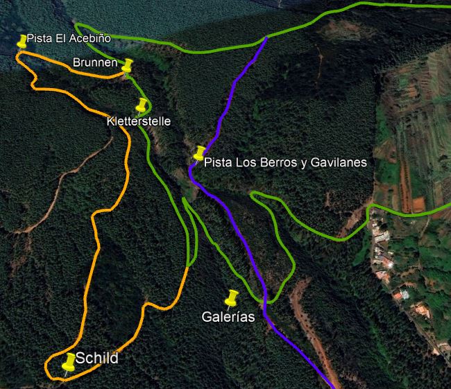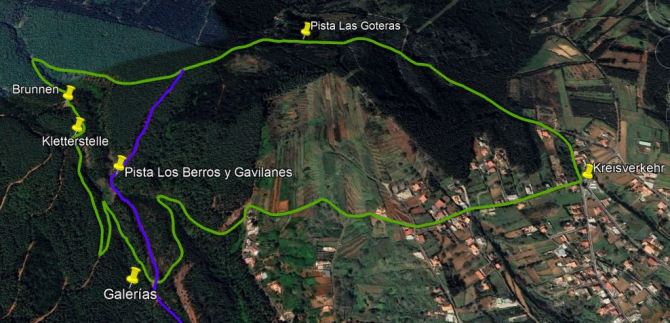 Genau gegenüber beginnt ein schmaler Waldpfad, der zunächst etwas zugewachsen ist, aber trotzdem gut erkennbar. Er verläuft am Hang entlang in ein Tal hinein und überquert nach 150 m den Bachlauf. Dort geht ein ebener Weg nach links weiter, wenn man dort rund 50 m entlang läuft, kommt man an einigen Stolleneingängen vorbei, die alle zur Galería Los Berros gehören. Auf diesem Weg kommt auch der unten beschrieben Spaziergang herauf (siehe Karte, gelb).