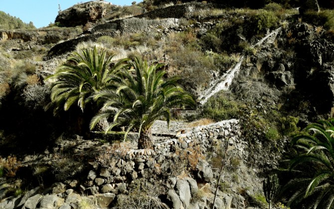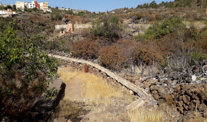 Von hier aus kann man weiter auf dem alten Weg hinauf steigen zu einem alten Weiler, dem Caserío sobre la Fuente. Der Weg ist hier nicht mehr ganz so bequem, sondern steil und steinig. Vorbei an alten Wasserkanälen erreicht man den Weiler, der heute nicht mehr bewohnt ist. Mehrere Familien wohnten hier und bauten in der Umgebung Getreide an. Sie hatten es gut, denn die Wasserquelle lag ja fast vor dem Haus.
