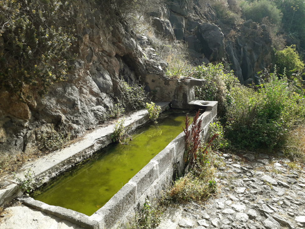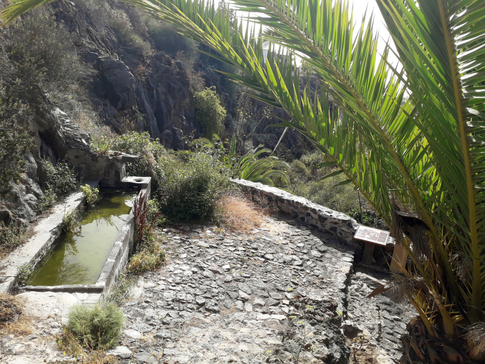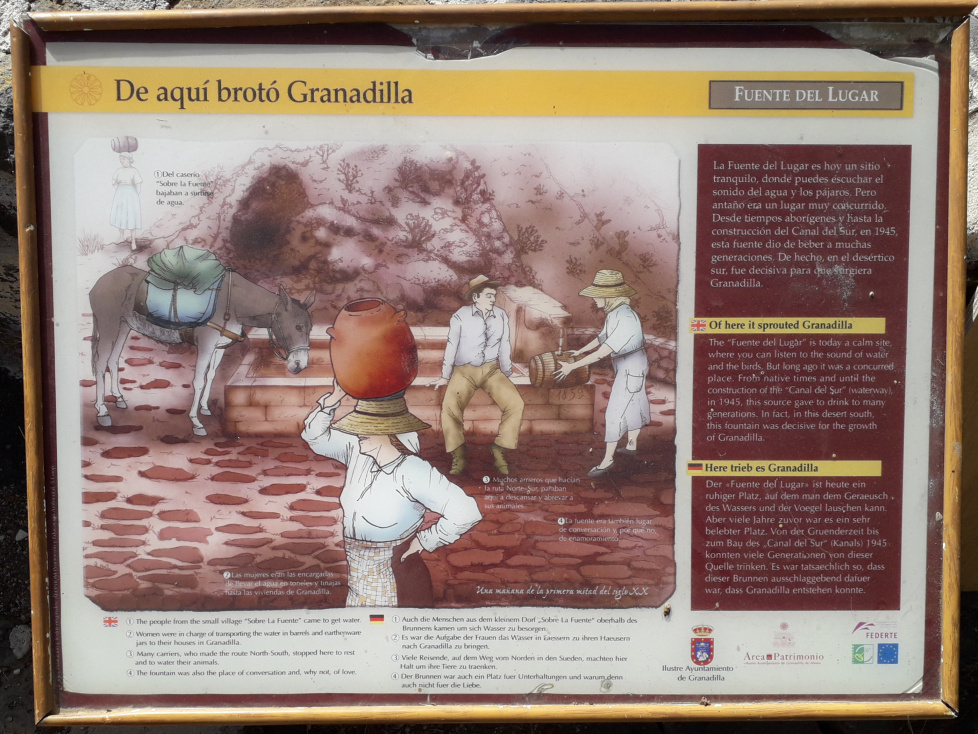 Auf der anderen Talseite kommt man dann zur Fuente del Lugar. An der Brunnenschale sieht man die Jahreszahl 1859 eingemeißelt, aber es ist ziemlich sicher, dass es diese Quelle schon im 18. Jahrhundert gab. Heute ist es ein ruhiger Platz, aber als früher die Frauen hier Wasser holten und die Hirten ihr Vieh tränkten, war die Quelle ein wichtiger sozialer Treffpunkt. Direkt am alten Fernverbindungsweg vom Norden in den Süden war sie eine wichtige Voraussetzung dafür, dass hier der Ort Granadilla entstehen konnte. Bis 1945, als der Canal del Sur gebaut wurde, war dieser Brunnen grundlegend für die Wasserversorgung des Ortes.