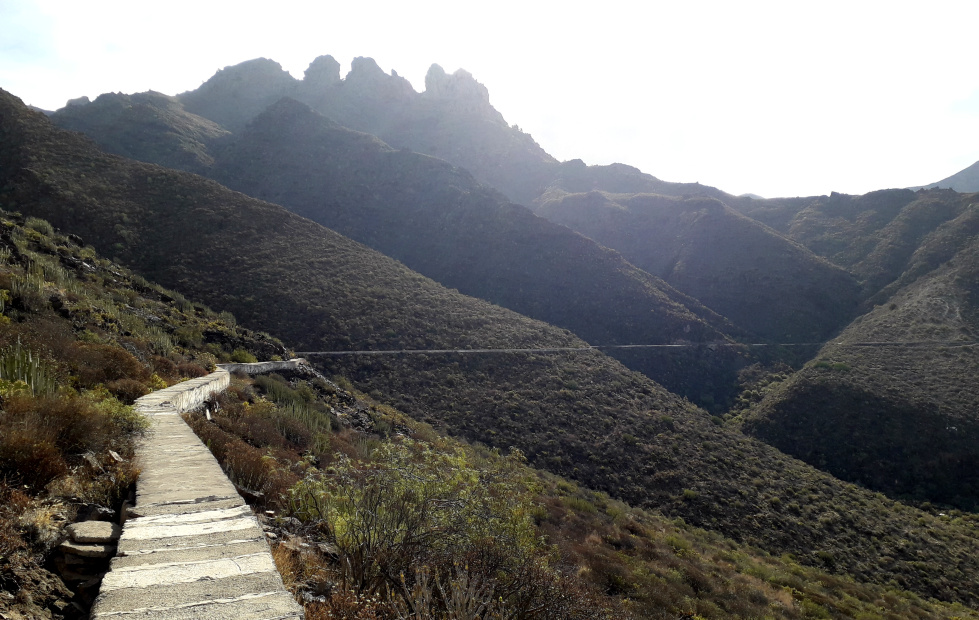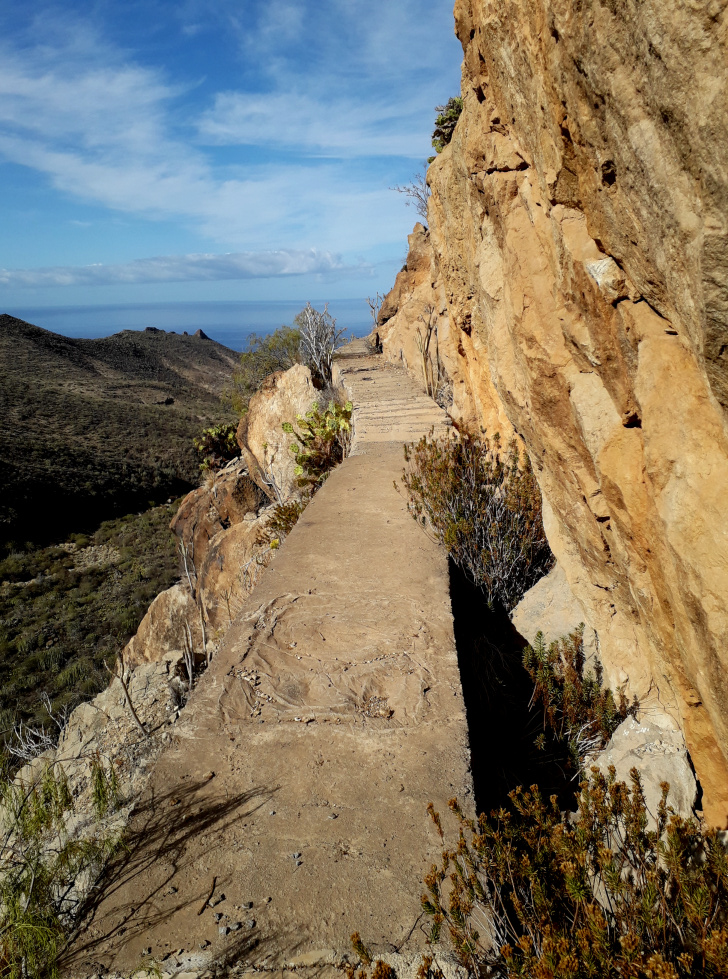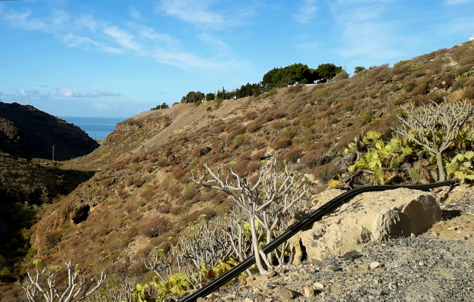 Der Grat senkt sich dann ab, und man kommt nach anstrengender Kletterei schließlich an eine Stelle, wo ein Wasserrohr quert. Hier überquert auch der Camino Viejo de Adeje den Bergrücken.