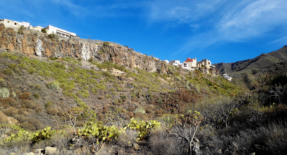 Die Tour beginnt direkt am Friedhof von Adeje. Unterhab des Friedhofes ist ein großer Parkplatz, am oberen Ende ein kleinerer. Genau dort beginnt eine Piste, die ins Tal hinunter verläuft. An der Schranke hängt zwar ein verrostetes Schild, dass der Weg nur für autorisiertes Personal ist, aber das interessiert niemanden. Oberhalb der Felsen liegt das Zentrum von Adeje.