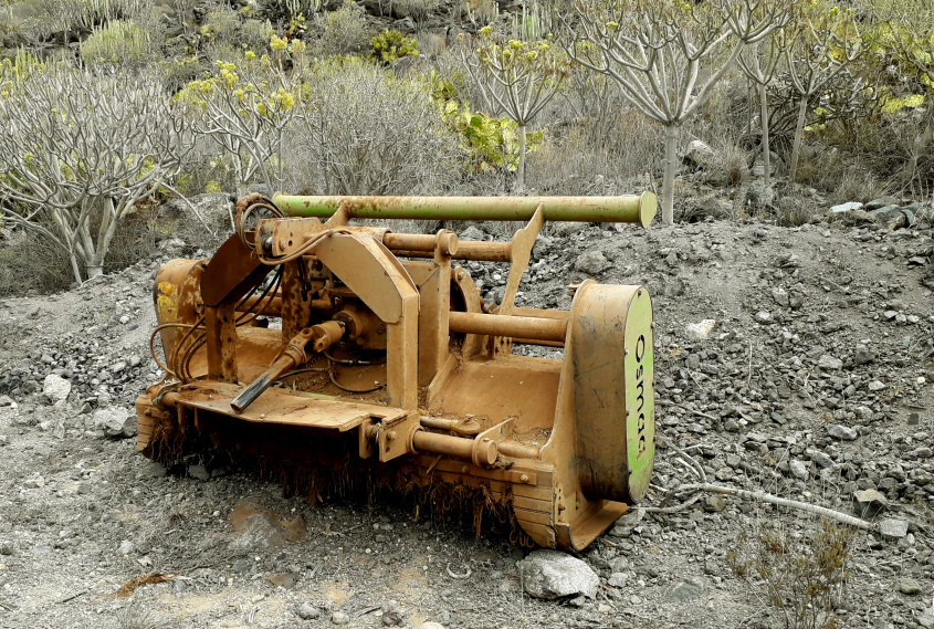 In einige Kurven geht es auf dem staubigen Weg 600 m abwärts, bis man an der tiefsten Stelle zu einer charakteristischen Kreuzung kommt. Dort biegt man links ab. Hier steht noch eine alte, verrostete Maschine, die vielleicht mal ein Pflug gewesen sein könnte.
