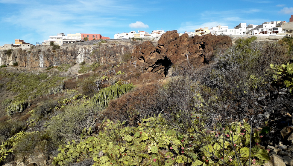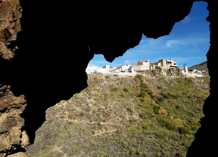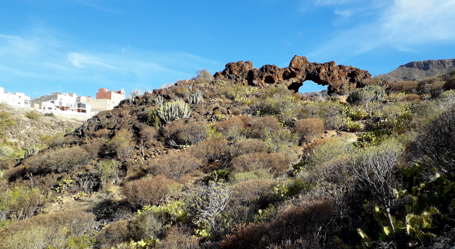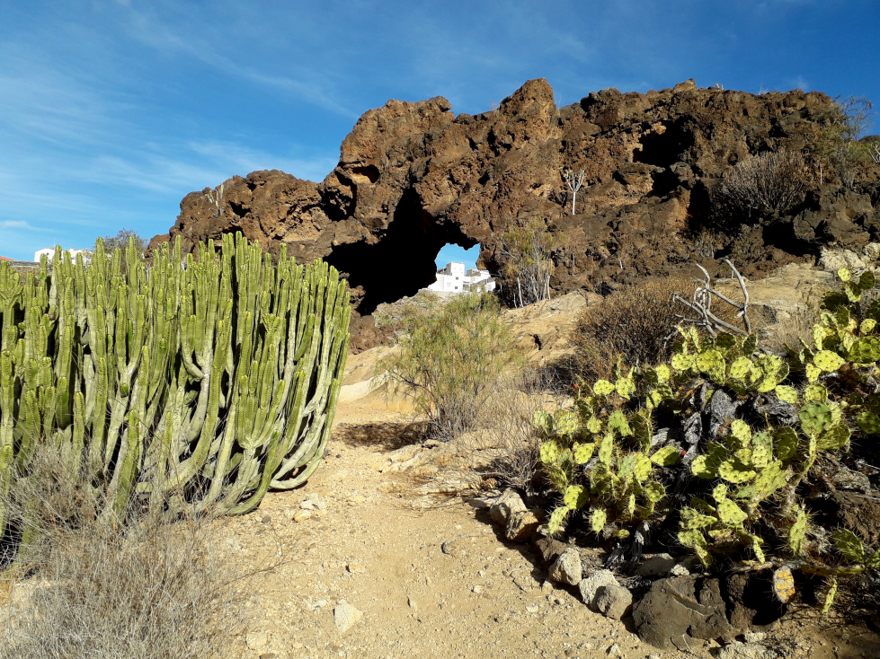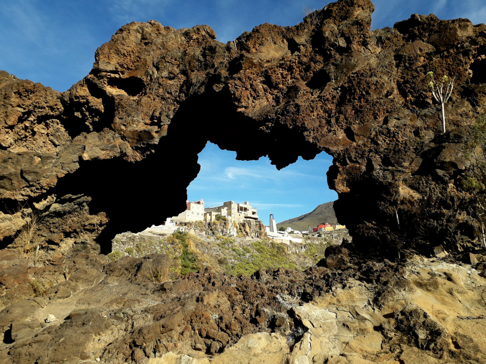 Etwas weiter oben siehtt man schon gut das erste Highlight dieser Tour. Es ist ein überraschender Felsbogen aus dunklem Basaltgestein, das sich erstaunlich von den weißen Tuffgesteinen der Umgebung abhebt. Man kann direkt bis zum Bogen gehen. Vorsicht: Dahinter geht es senkrecht nach unten. Auf der gegenüber liegenden Talseite erheben sich über dem Kliff die Häuser von Adeje. Man sieht auch die moderne Kirche.