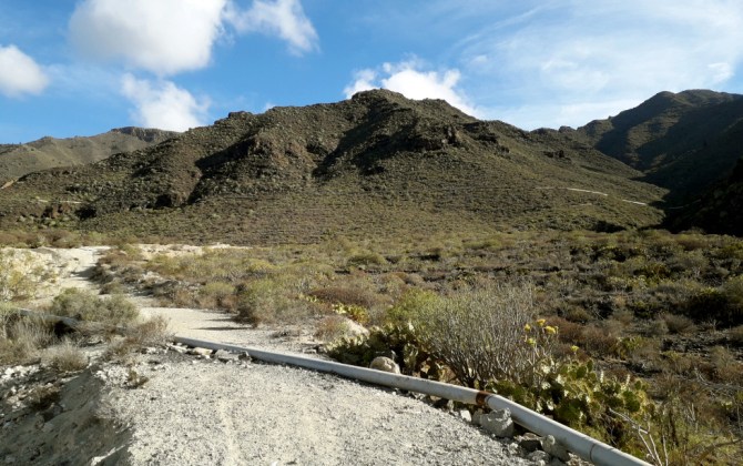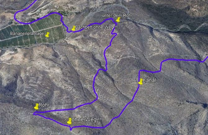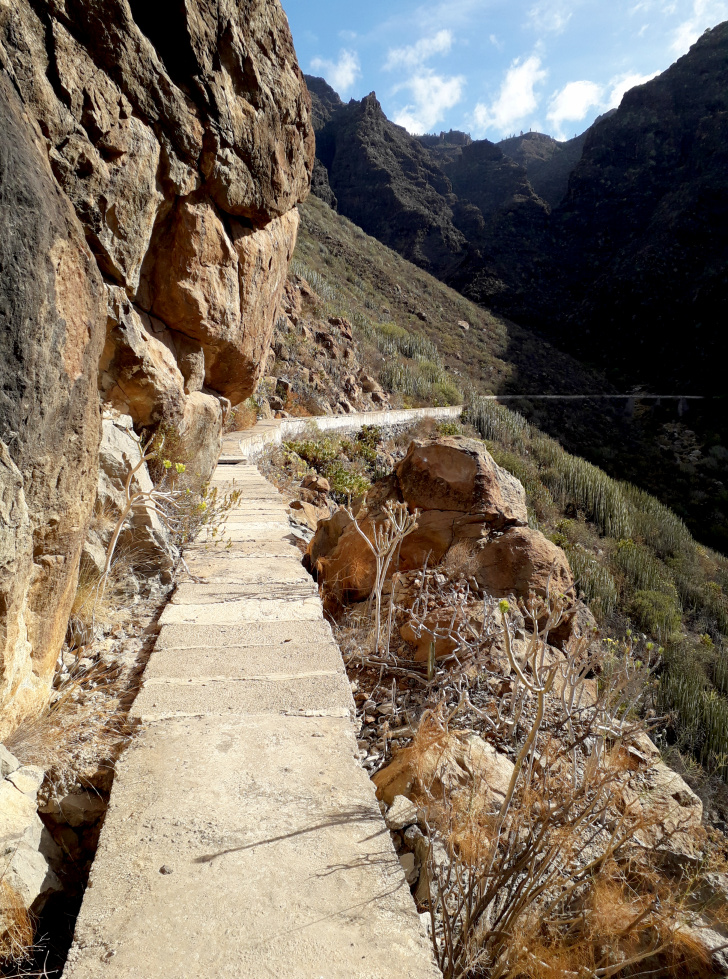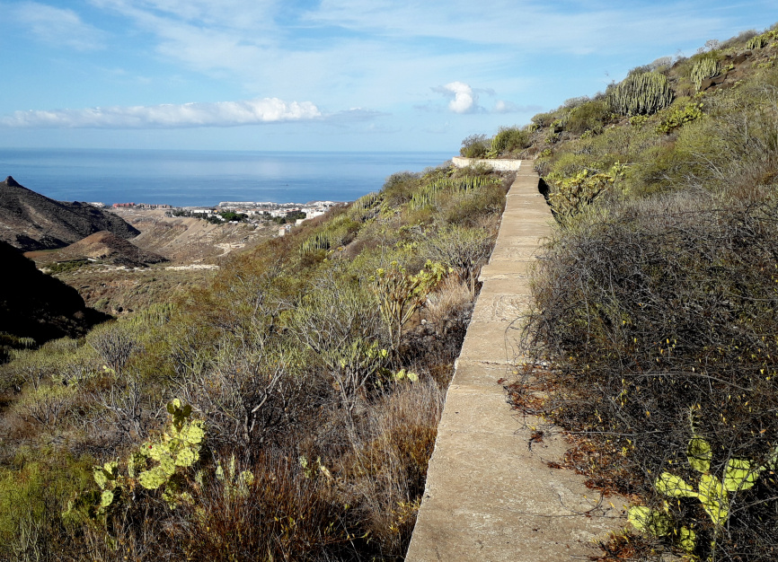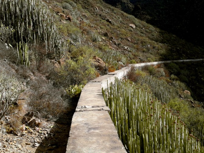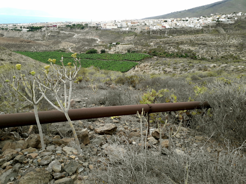 Beim Wasserrohr geht man nun nach rechts hinunter auf einem gut erkennbaren und einigermaßen bequemen Pfad, es ist der alte Weg nach Adeje. Er verläuft immer neben dem Rohr, biegt aber noch einmal kurz in ein Seitental ab. Nach ziemlich genau einem Kilometer wird es etwas steiler. Dort kann man unter dem Rohr hindurch gehen und danach weiter auf einem Weg, der eigentlich keiner ist. Es ist eher ein steiniges und ziemlich steiles Bachbett, sehr unfreundlich zu gehen, aber nicht zu verfehlen.