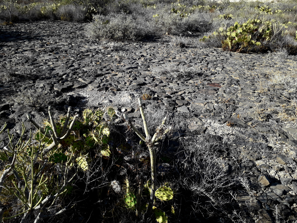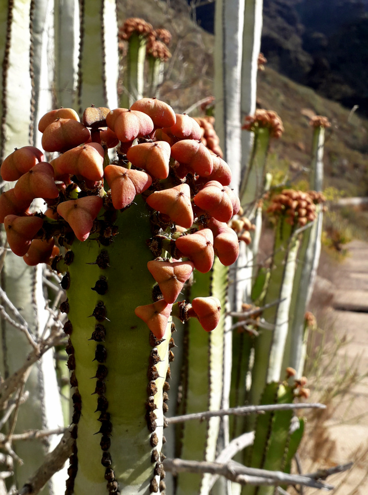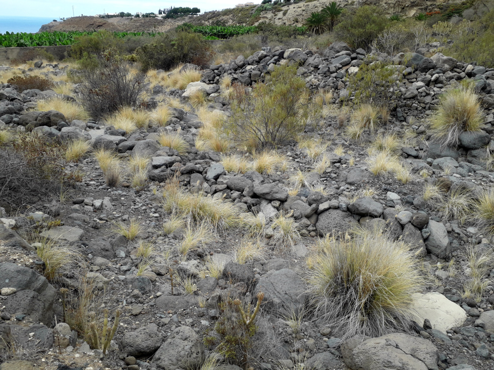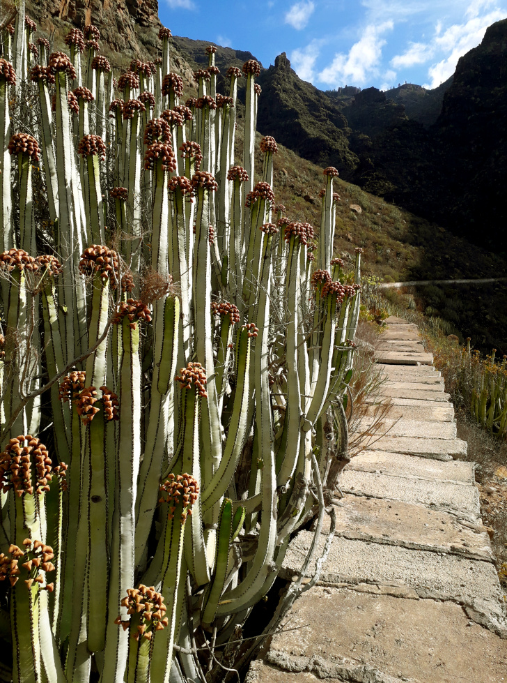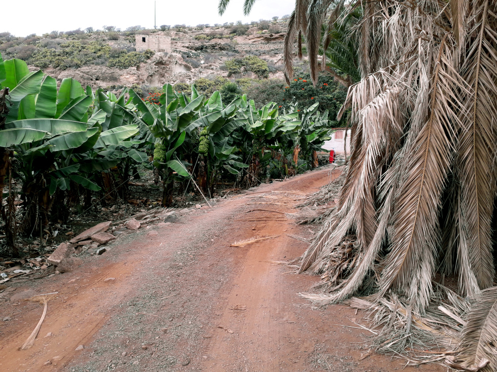 Beim Wasserrohr geht man nun nach rechts hinunter auf einem gut erkennbaren und einigermaßen bequemen Pfad, es ist der alte Weg nach Adeje. Er verläuft immer neben dem Rohr, biegt aber noch einmal kurz in ein Seitental ab. Nach ziemlich genau einem Kilometer wird es etwas steiler. Dort kann man unter dem Rohr hindurch gehen und danach weiter auf einem Weg, der eigentlich keiner ist. Es ist eher ein steiniges und ziemlich steiles Bachbett, sehr unfreundlich zu gehen, aber nicht zu verfehlen.