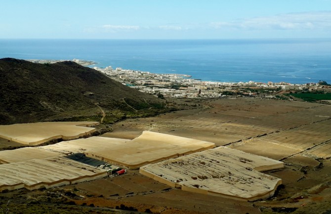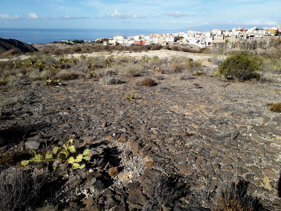 Genau an dem Punkt, wo der Kanal diesen Rücken überquert und scharf nach links knickt, verlässt man den Kanal nach rechts. Es gibt eine Stelle an der Kurve, wo man leicht herunter steigen kann. Hier geht der Blick nach Süden bis nach Los Cristianos. Und hier beginnt ein weiteres Abenteuer.