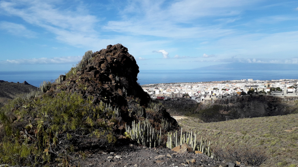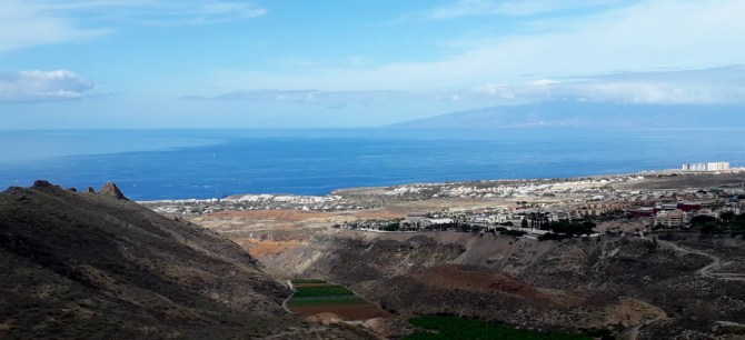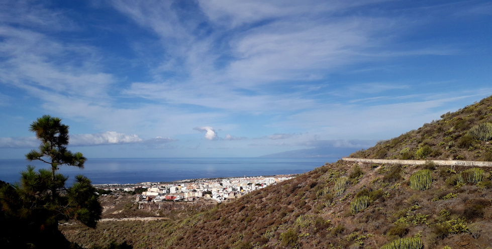 Nach der Brücke hat man wieder einen schönen Blick hinaus ins Tal und hinüber nach Adeje. Bald blickt man auch hinaus auf den Höhenrücken des Morro Grueso, der in einem charakteristischen Felsklotz endet. In der Ferne erkennt man die Nachbarinsel La Gomera.