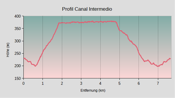 Höchster Punkt: 380 m, tiefster Punkt 200 m