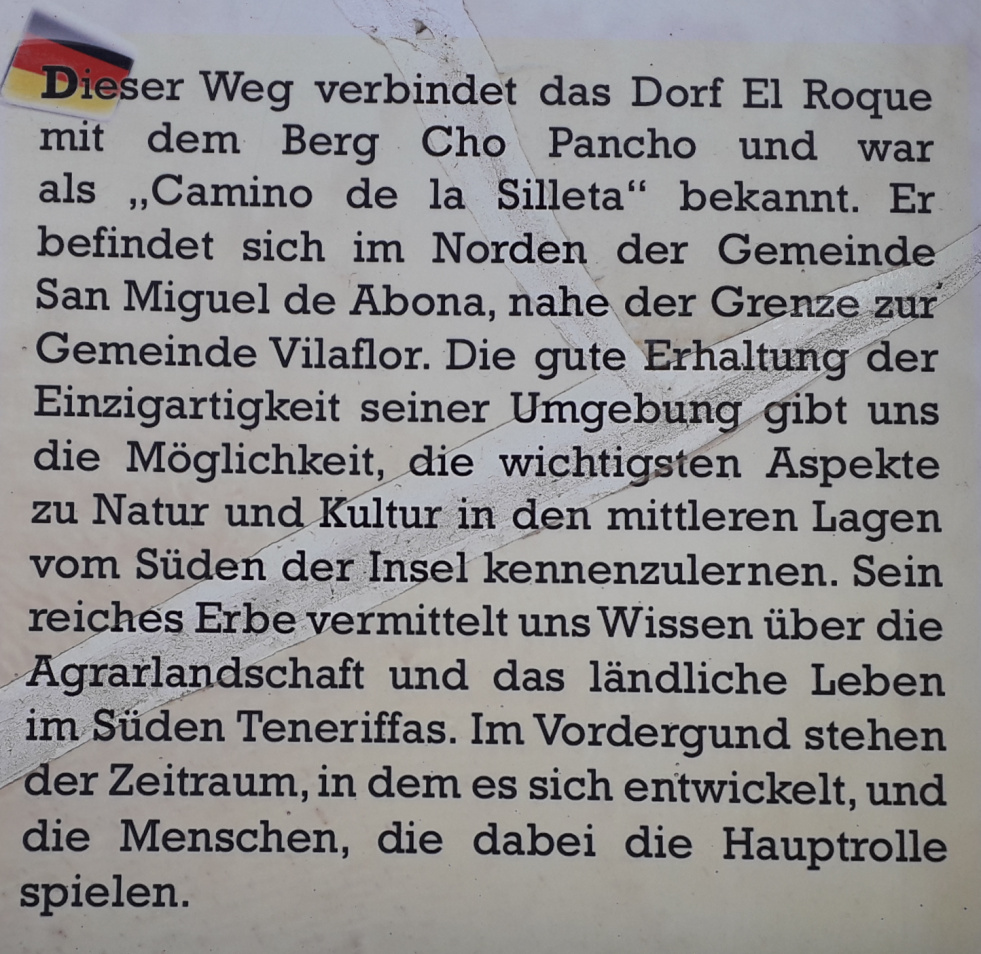 Dieser Weg ist auch als Camino de la Silleta bekannt und verbindet auf 3,4 km Länge den Ort El Roque mit dem Monte Cho Pancho. Blickt man nach unten, hat man ein weites Panorama mit dem 781 m hohen Roque Jama in der Mitte. Er ist ein Naturdenkmal und einer der „heiligen“ Berge der Guanchen. Roque Jama, Centinela und Conde sind die Reste der allerersten Landmassen aus der Entstehung der Insel.
