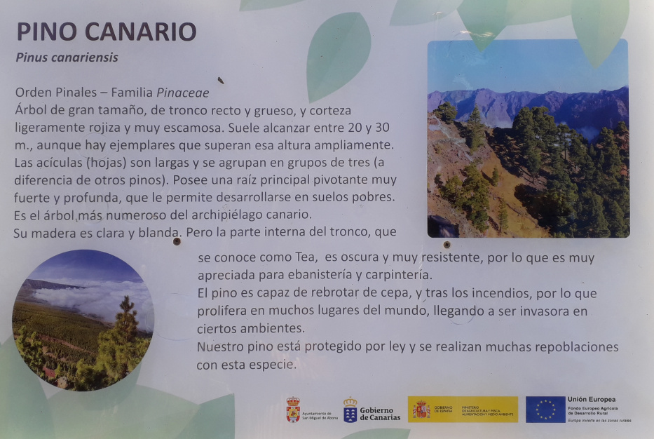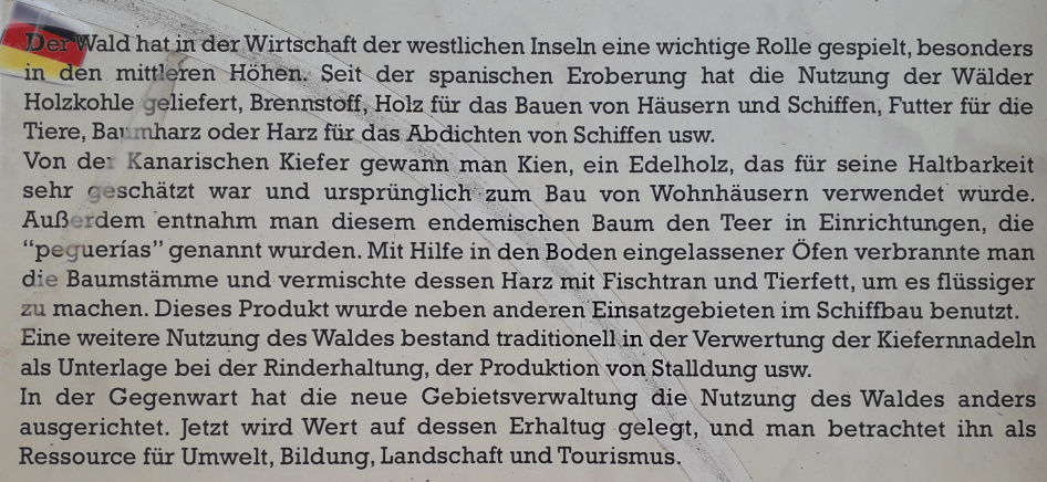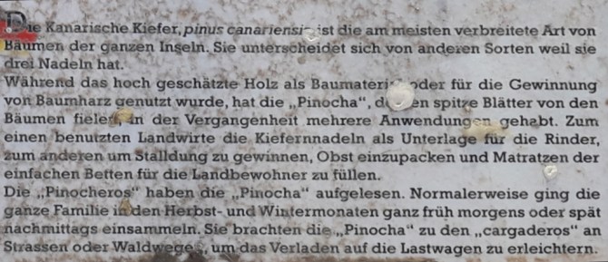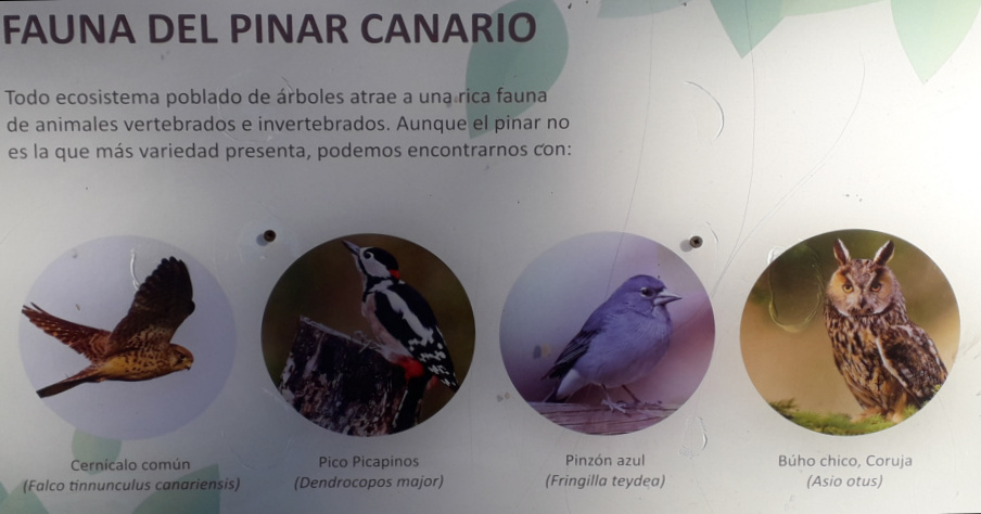 Dieses war der untere Teil der Wanderung. Nun kann man sicher eine ausgiebige Pause und eine Stärkung gut gebrauchen. Auf den Informationstafeln erfährt man nebenbei einiges über den Wald. Den Falken, den „Picapinos“ und den blauen Teidefink kann man hier vielleicht beobachten, die Eule bei Tag wahrscheinlich nicht.