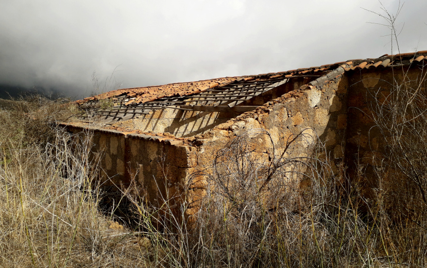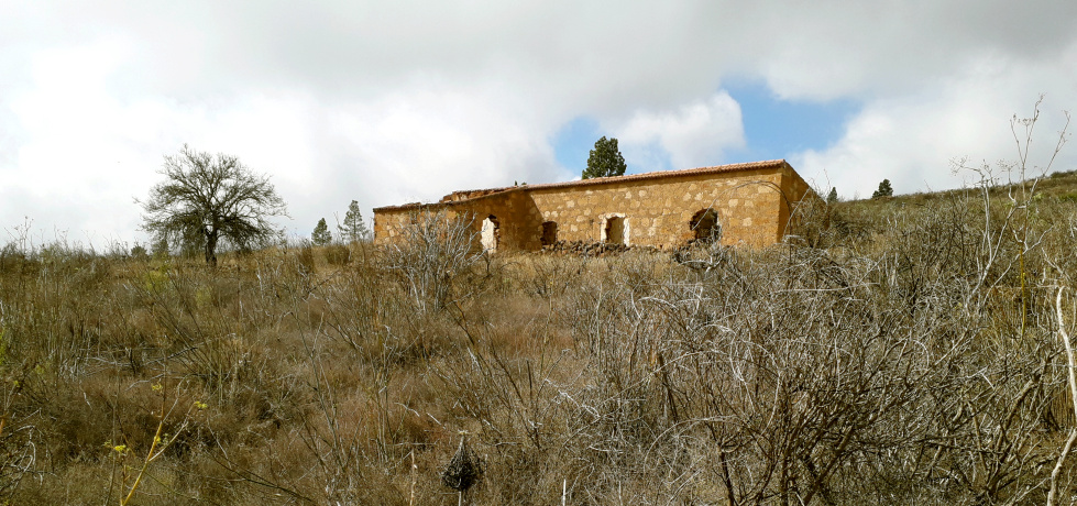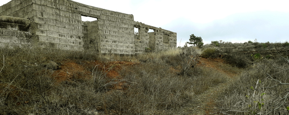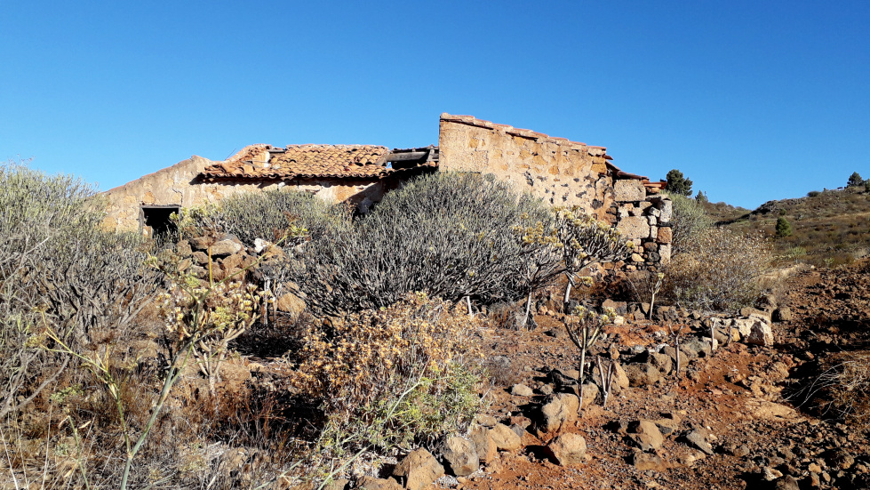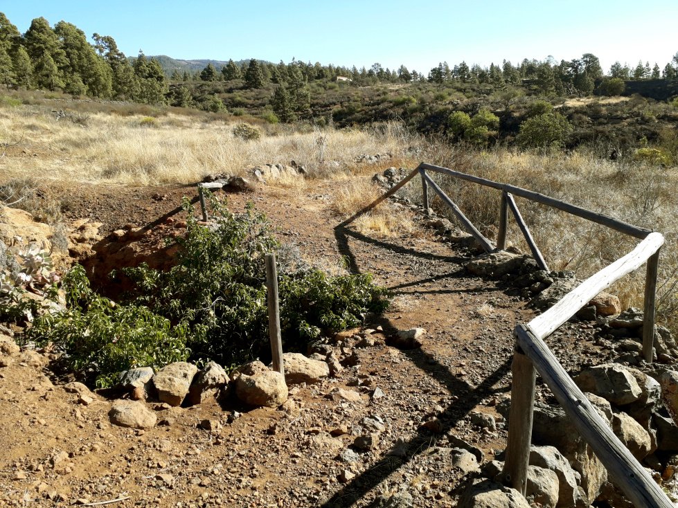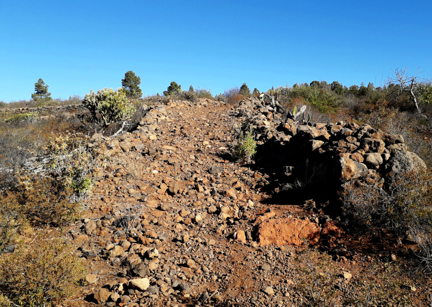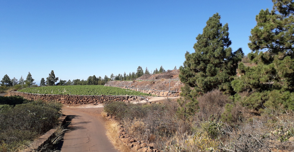 Leicht bergauf kommt man zu einem nicht fertig gestellten Gebäude. Dahinter beginnt ein Wanderpfad, der zunächst schmal zwischen den Terrassenfeldern ansteigt und danach breiter wird. 350 m nach dem unfertigen Gebäude kommt man zu einem verfallenen Haus und geht dann an einem kleinen Barranco entlang weiter. Danach darf man nicht in die Schlucht hinunter gehen, sondern biegt nach rechts ab und gleich wieder links, immer zwischen den Terrassenfeldern nach oben. Durch ein kleines Tal geht es weiter. 50 m hinter einer Schranke geht man nach rechts aufwärts und dann oberhalb einer Kiefer ganz eben weiter. Dieser Weg stößt 200 m weiter senkrecht auf einen anderen.