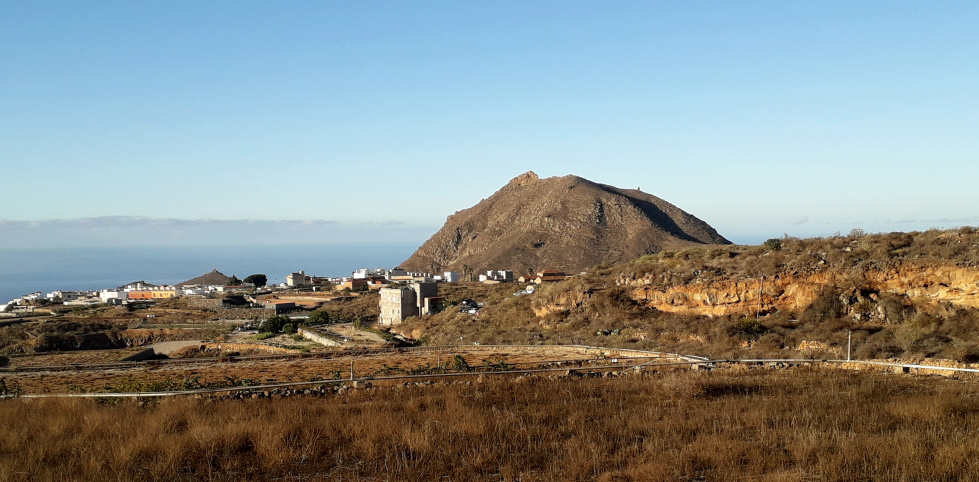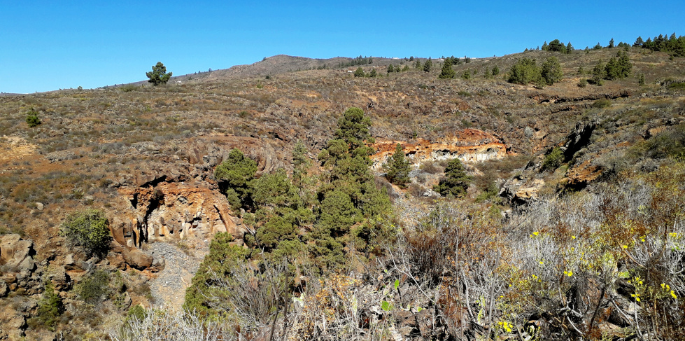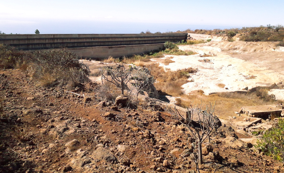 Vom Picknickplatz geht man zunächst auf der Zufahrtstraße 800m zurück bis zur Hauptstraße, vorbei an neu hergerichteten und genutzten Feldern. Hier hat man auch einen schönen Blick hinauf zu den Bergen. Kurz vor der TF-563 zweigt nach rechts unten eine andere kleine Nebenstraße ab. Dort geht es zunächst einmal bequem bergab. Man hat auch bald einen schönen Blick in den Barranco de la Mesa. Nach 800 m biegt die Straße nach links, und dort beginnt geradeaus eine steinige Piste, die später zu einem Wanderweg wird. Er macht nach etwa 300 m einen Bogen um ein nicht mehr verwendetes Staubecken herum.
