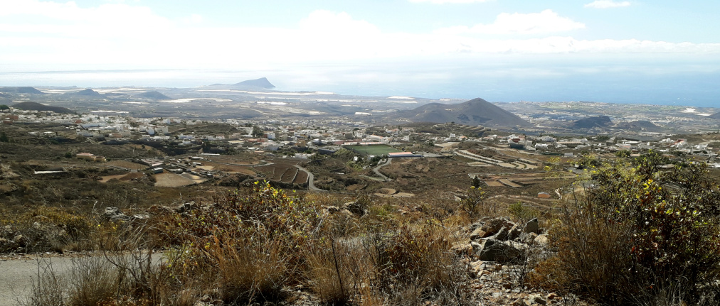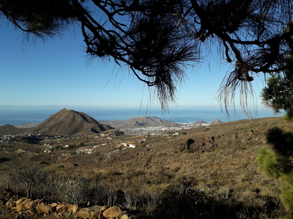 Diese ist aber richtig steil. Die Aussicht geht weit hinunter über die gesamte Landschaft des Südwestens, bis zur Küste und der markanten Montaña Roja, über San Miguel und Granadilla hinweg bis zum Hafen, und weiter rechts bis zum ebenfalls sehr markanten Roque de Jama. Später kommt man zuerst an einem abgedeckten Wasserreservoir vorbei, auf der rechten Seite, 200m später an einem runden, ebenfalls abgedeckten Wasserbehälter, auf der linken Seite. 50m danach muss man aufpassen und rechts abbiegen. Die Piste geht kurz bergauf und dann nach links hinunter in den Barranco de la Mesa.