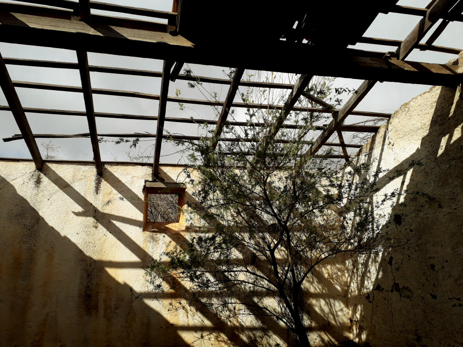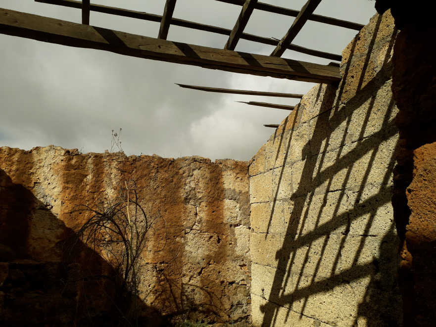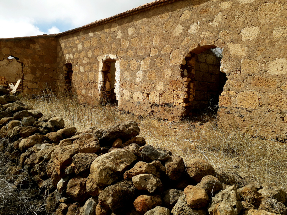 Der weitere Aufstieg ist eindeutig und weiterhin steinig. Man kommt an einem verfallenen Haus vorbei. Gegenüber liegt ein kleiner Dreschplatz, ein Zeichen dafür, dass früher einmal hier Getreide angebaut wurde.