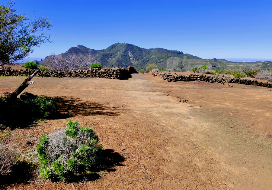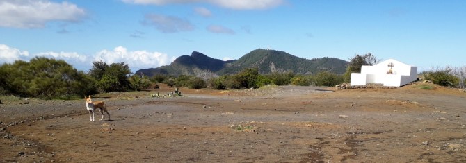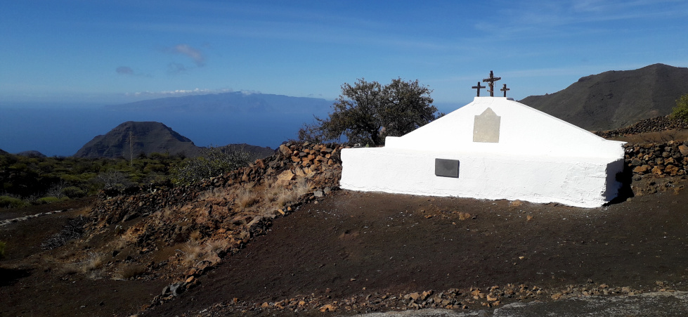 Der etwas steinige Pfad steigt bergauf und trifft nach knapp 200 m auf eine breitere Piste, wo man nach links geht. 250 m weiter oben kommt man am Calvario Santo Angel vorbei, eigentlich keine Kapelle, sondern nur ein blendend weiß gestrichenes Gemäuer mit drei Kreuzen. Von hier hat man bereits einen schönen Ausblick nach Westen über Las Manchas und hinüber zur Insel La Gomera.