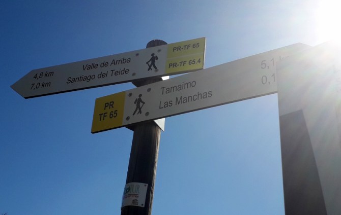 Startpunkt ist der Ort Las Manchas, wo man, von Santiago kommend, gleich nach der Abzweigung von der TF-375 am Ortseingang parken kann. 50 m weiter steigt nach links die Calle Bilma an, die oben wieder auf die Hauptstraße kommt. Diese überquert man und sieht links der Bushaltestelle auch schon den Wegweiser Richtung Valle de Arriba (PR TF-65).