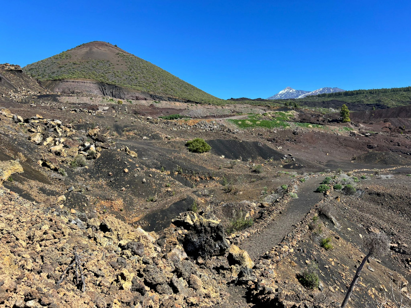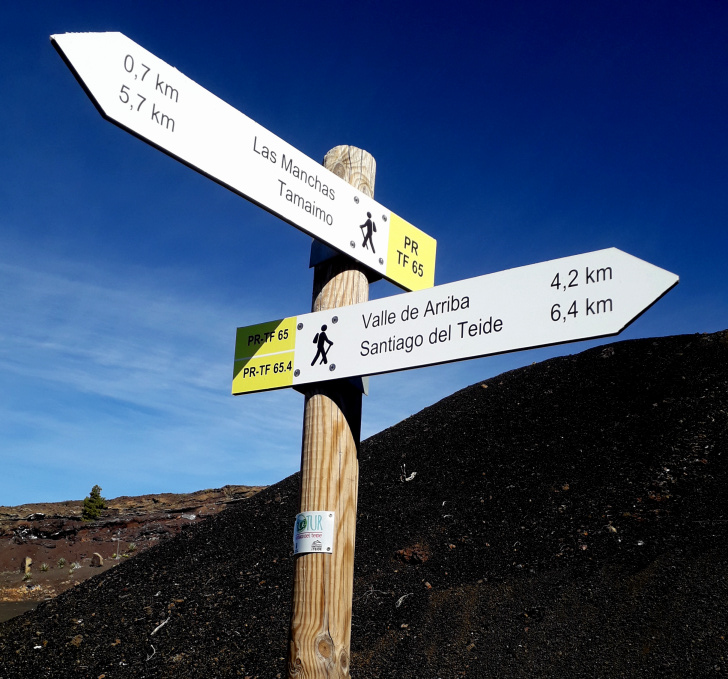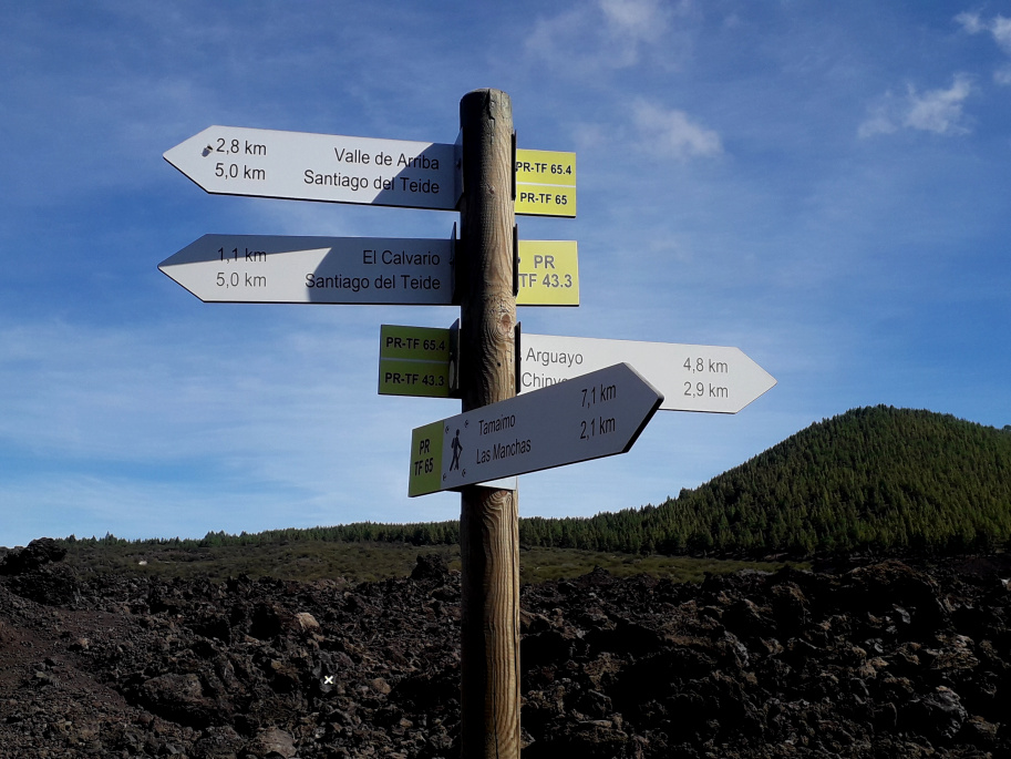 Danach geht man gegenüber des weißen Gemäuers entlang des Lavastroms weiter. 300 m weiter zweigt der offizielle Wanderweg PR TF 43.3 rechts ab. Geradeaus zeigen zwei weiß-gelbe Kreuze an, dass dort der offizielle Weg nicht weiter geht. Auf diesem könnte man rechts abbiegen, wenn man auf den Blick in den Tagebau verzichten will.