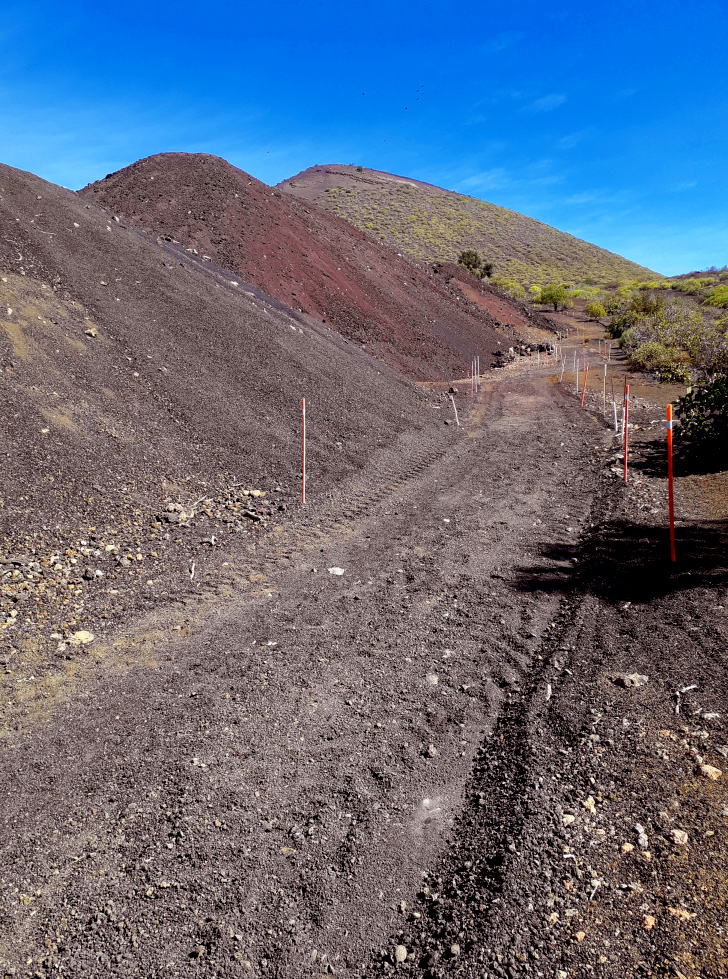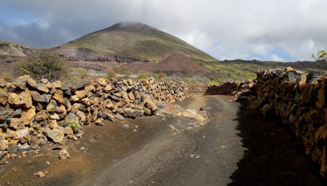 Man überquert die Piste, auf der die LKWs das abgebaute Material nach unten transportieren und geht hinüber zu einem schwarzen Aschefeld, wo man bei dem Wegweiser wieder auf den Hinweg trifft. 50 m oberhalb des Calvario zweigt nach rechts eine Piste ab, die zwischen hohen Steinmauern weiter bergab führt. Man kommt an einem Schweinestall vorbei und ist danach schnell wieder an der Hauptstraße.