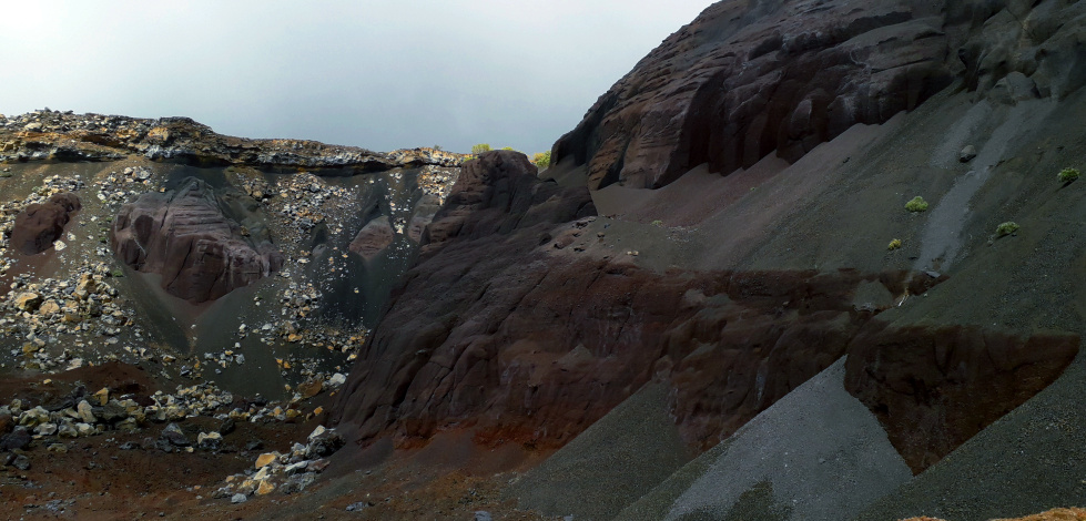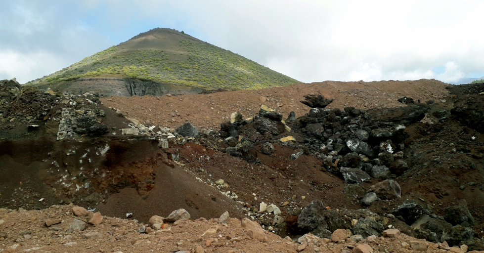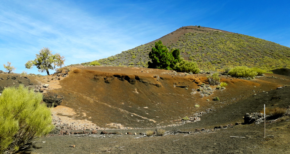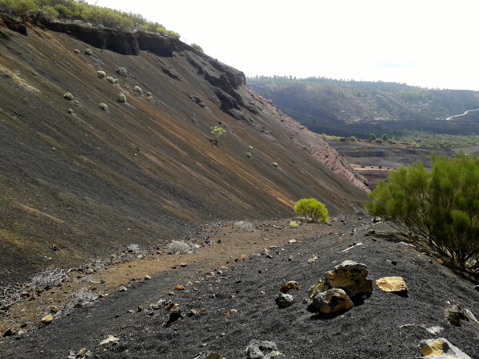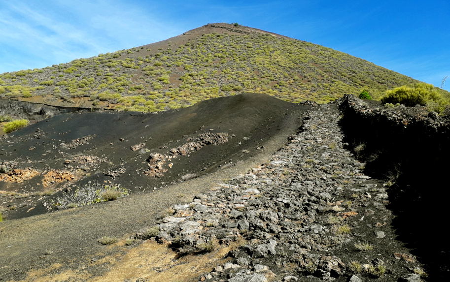 Weitere 150 m höher biegt man rechts ab und geht dann rechts an der braunen Abraumhalde vorbei bergauf, immer auf die Montaña Bilma zu. Der Weg ist nicht besonders steil, aber es sind jetzt noch 200 Höhenmeter zu schaffen, was auf dem lockeren Vulkangestein etwas anstrengend ist. Weiter oben, direkt am Fuß des Bergs, wird der Weg aber wieder bequemer.