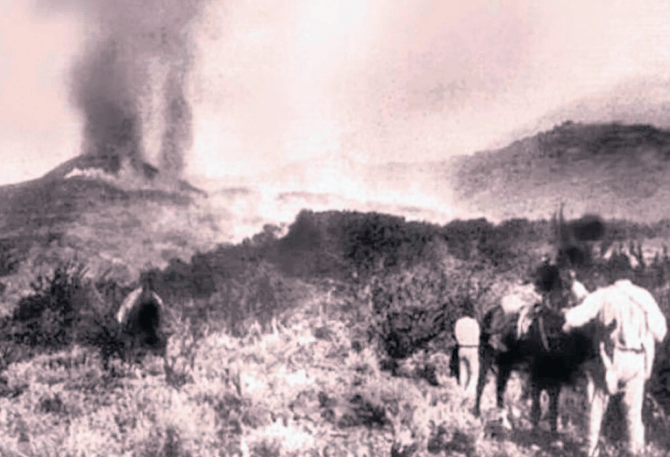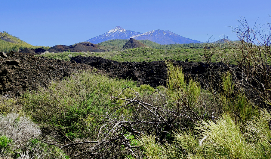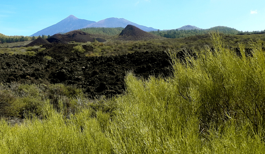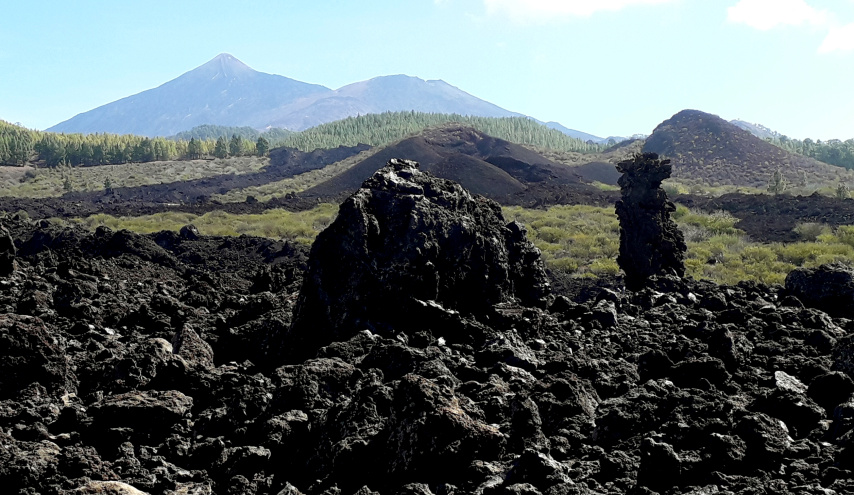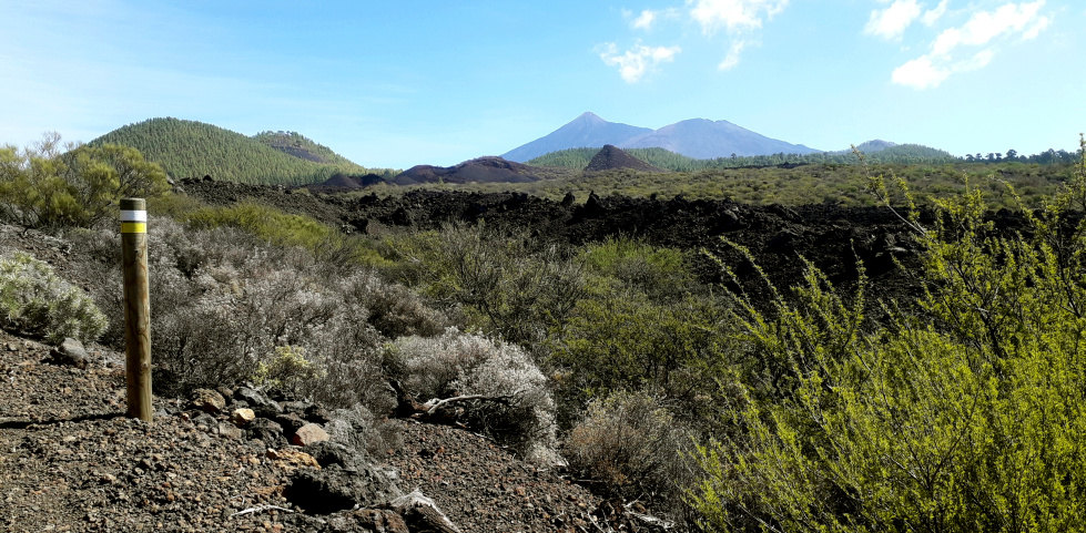 Rechts ist bereits einer der Lavaströme des Chinyero, den man als relativ harmlos aussehenden Berg vor der Kulisse des Teide und des Pico Sur nun erkennen kann. Beim letzten Vulkanausbruch auf Teneriffa im November 1909 floss die Lava in mehreren Strömen vor allem nach Norden und Westen Richtung Santiago del Teide. Es war der erste (und letzte) Ausbruch auf Teneriffa, der auch fotografisch dokumentiert wurde. Man erzählt sich, dass damals die Bevölkerung der unterhalb liegenden Dörfer mit dem Pfarrer und einem Kreuz voran Richtung Vulkan gezogen ist, um der Lava Einhalt zu gebieten. Und tatsächlich hielt der Lavastrom inne, ein Stück oberhalb des Calvario Santo Angel.