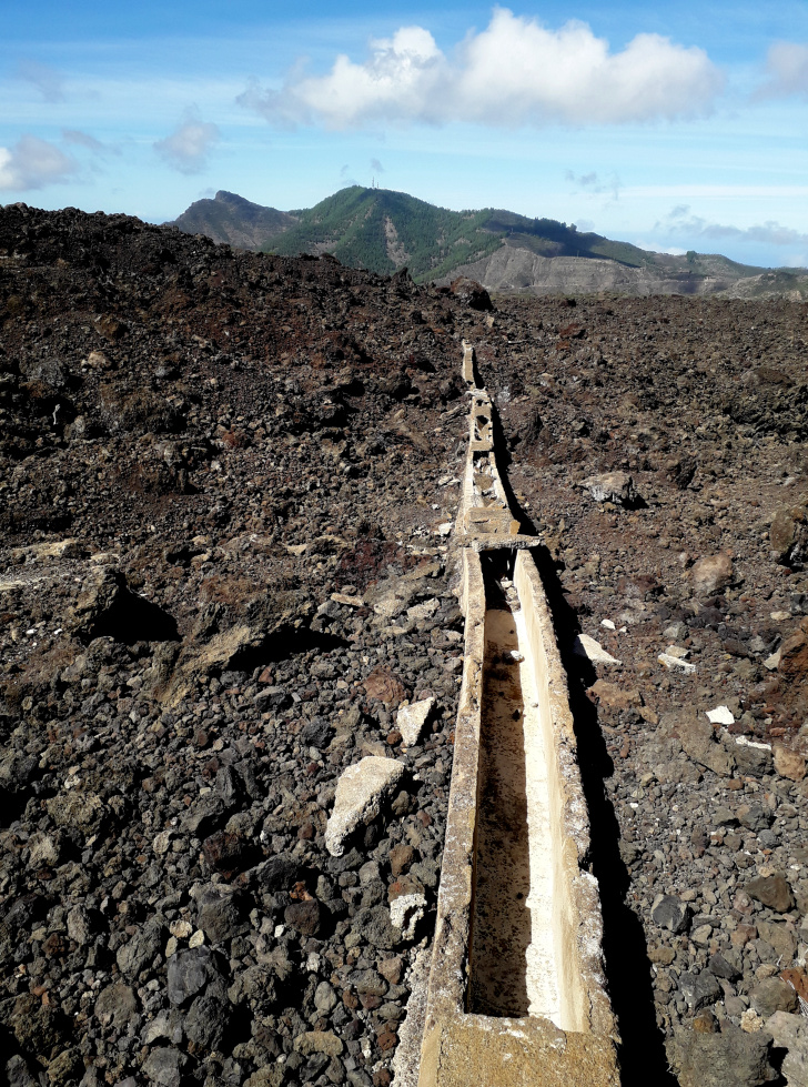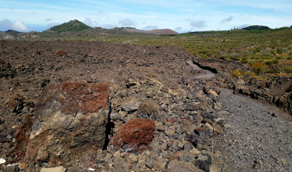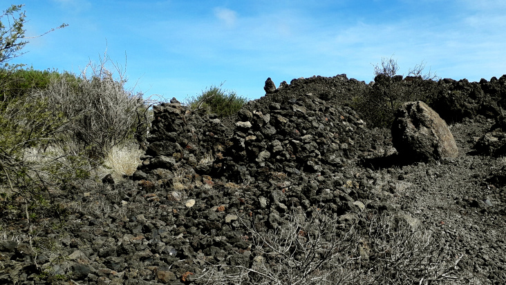Der Wanderweg geht dann in den Lavastrom hinein. Kurz davor sind die Mauern einer alten Schutzhütte, danach biegt man auf dem ausgeschilderten Weg PR TF 43.3 links ab. Rund 500 m geht man nun im oder neben dem Lavastrom. Kurz nachdem man einen alten Wasserkanal überquert hat, stößt man auf ein breite Piste und geht geradeaus weiter, so lange bis links eine weitere breite Piste abzweigt. Diese führt um den Lavastrom herum und kommt gleich danach zum Calvario Los Baldios.
