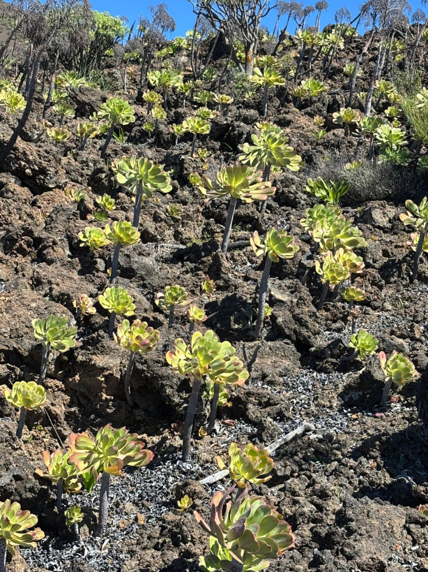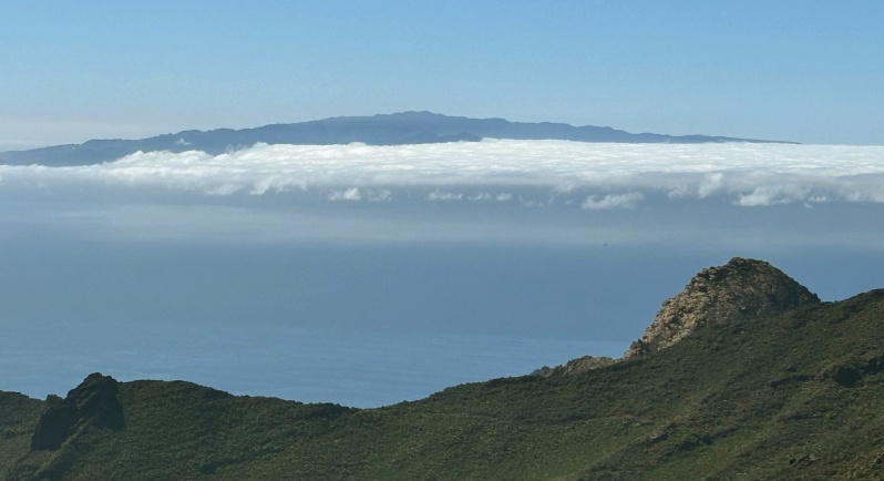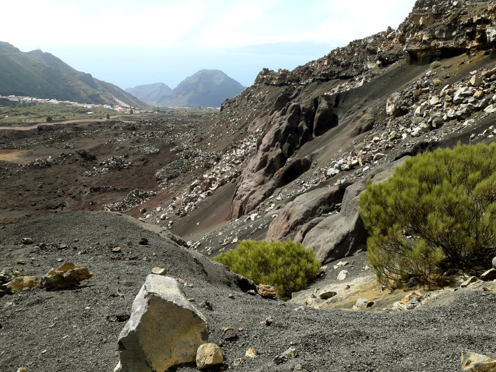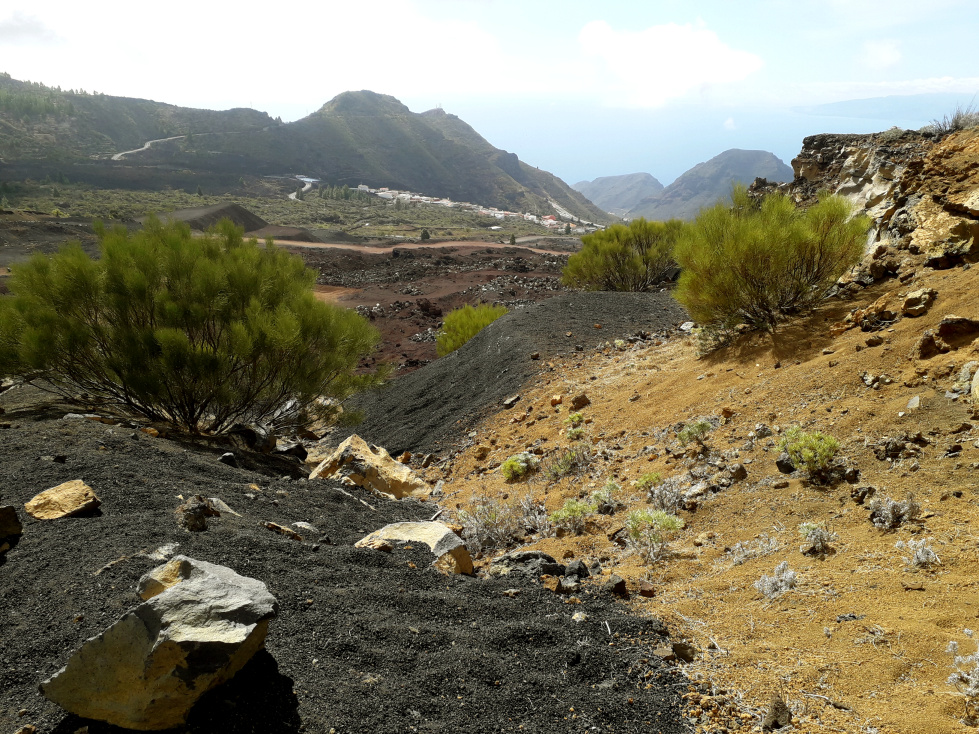 Wer stehen bleibt und zurück schaut, kann ein weites Panorama genießen, hinüber bis zur Masca-Straße, und mit Glück in der Ferne auch La Gomera und La Palma entdecken. Links des Wegs schaut man in das hässliche Bergbaugebiet, das man auf dem Rückweg noch näher kennenlernen wird.