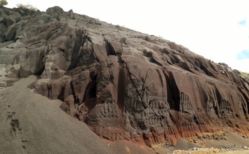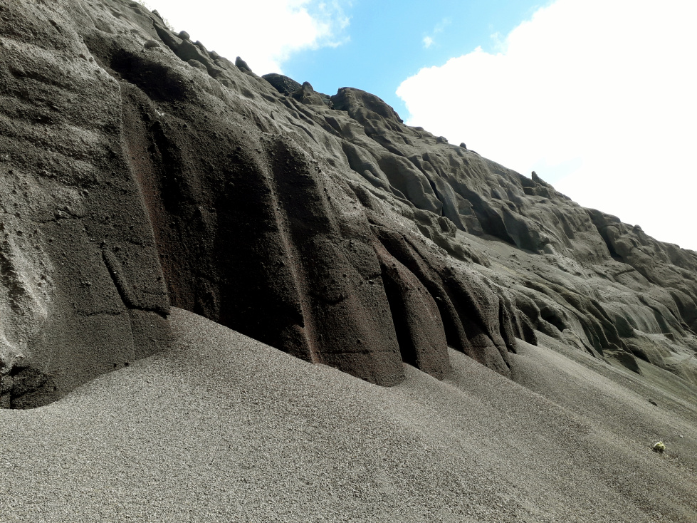 150 m weiter steht man am schroffen Rand der Tagebaugrube, und der Weg im lockeren Vulkanschotter geht steil bergab. Links erheben sich steile Felsen, an deren Fuß riesige Schotterhalden liegen. Weiter unten in der Grube graben sich die Bagger immer weiter ins Gestein. Schön ist das nicht mehr. Die Landschaft wird komplett zerstört. Aber irgendwo muss das Baumaterial für die Insel ja herkommen.
