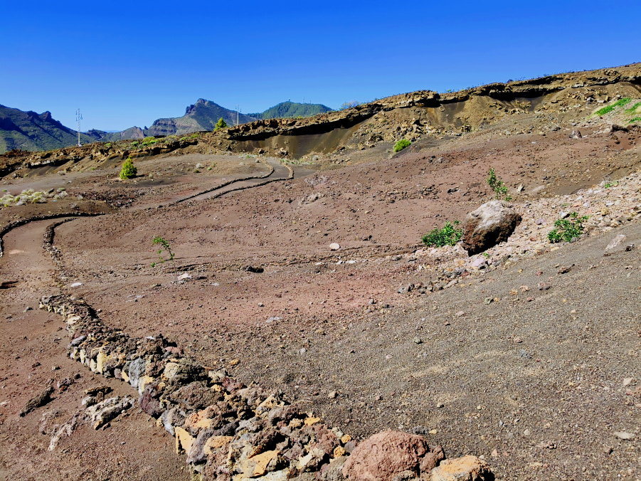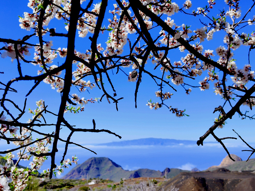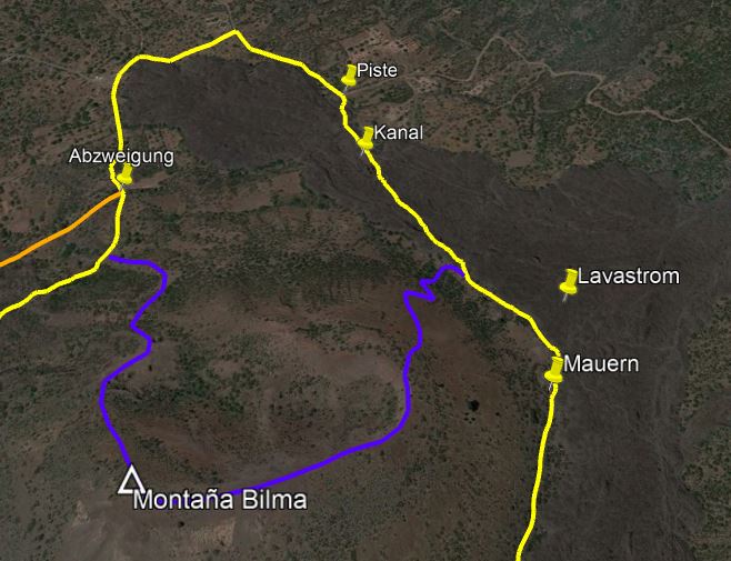 Die Montaña Bilma ist ein kleiner, uralter Vulkan mit etwa 1350m Höhe oberhalb von Santiago del Teide. Direkt dahinter befinden sich die Lavaströme des Chinyero. Die Westseite des Berges ist ein riesiger Steinbruch, wo im Tagebau das poröse Lavagestein abgebaut wird. Auf den Hängen unterhalb gab es früher einmal intensive Landwirtschaft, doch die Felder mit Wein, Mandeln und Feigen sind heute überwiegend verlassen. Die Wanderung um den Berg herum verläuft zum Teil auf offiziellen Wegen, aber auch auf undeutlichen Pfaden. Sie ist besonders schön, wenn im Februar die Mandelbäume blühen.