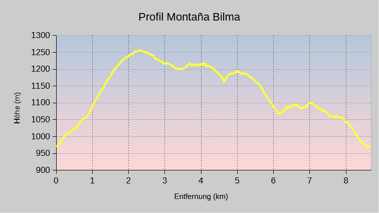 Höchster Punkt: 1255 m, tiefster Punkt 970 m