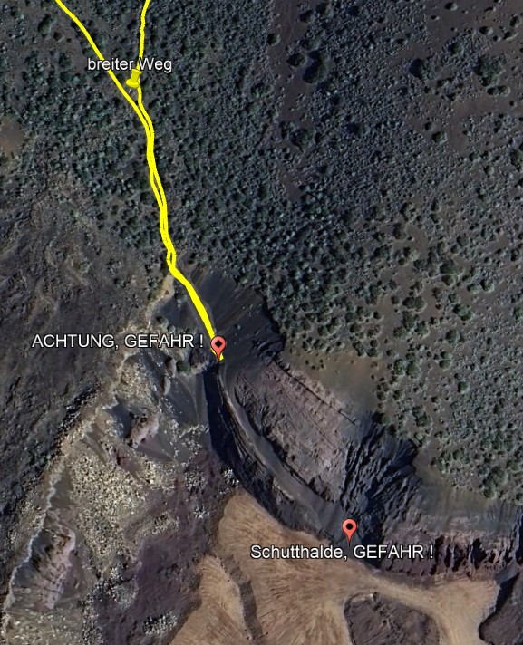 Obwohl der Weg dort hinab zunächst begehbar aussieht, sollte man nicht zu weit hinunter gehen. Es gibt einige sehr gefährliche Stellen mit absoluter Absturzgefahr. Weiter unten ginge es nur noch über die Schutthalde weiter. Dort kann man ohne Halt nach unten gefährlich abrutschen!