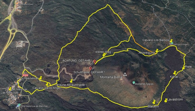 Eine andere Runde zur Montaña Bilma könnte man in Valle de Arriba beginnen. Dort beginnt am oberen Ende der Calle El Reventón ein Wanderweg, der zunächst steil, später flacher zum Calvario Los Baldios hinauf steigt. Man umrundet dann die Montaña Bilma im Uhrzeigersinn und geht unten quer durch den Tagebau und nach Überquerung des TF 43.3 auf dem TF 60.1 wieder zurück Richtung Valle de Arriba. Eine kleine Runde nur bis zum Calvario zeigt die Karte in weiß (3,9 km).