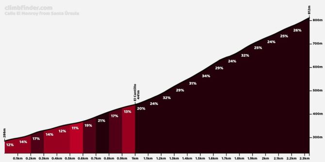 Es handelt sich um die Calle El Monroy, die nach dem Radfahrer-Portal climbfinder.com die größte Herausforderung der Kanaren ist. Sie steigt von 286 m Meereshöhe auf 812 m an, überwindet also einen Höhenunterschied von 526 Metern. Das ist für die Verhältnisse auf Teneriffa nicht viel, aber es ist nur eine Strecke von 2,3 km, was einer durchschnittlichen Steigung von 22,5 % entspricht. Die steilsten hundert Meter haben sogar einen Anstieg von 34,9 %.