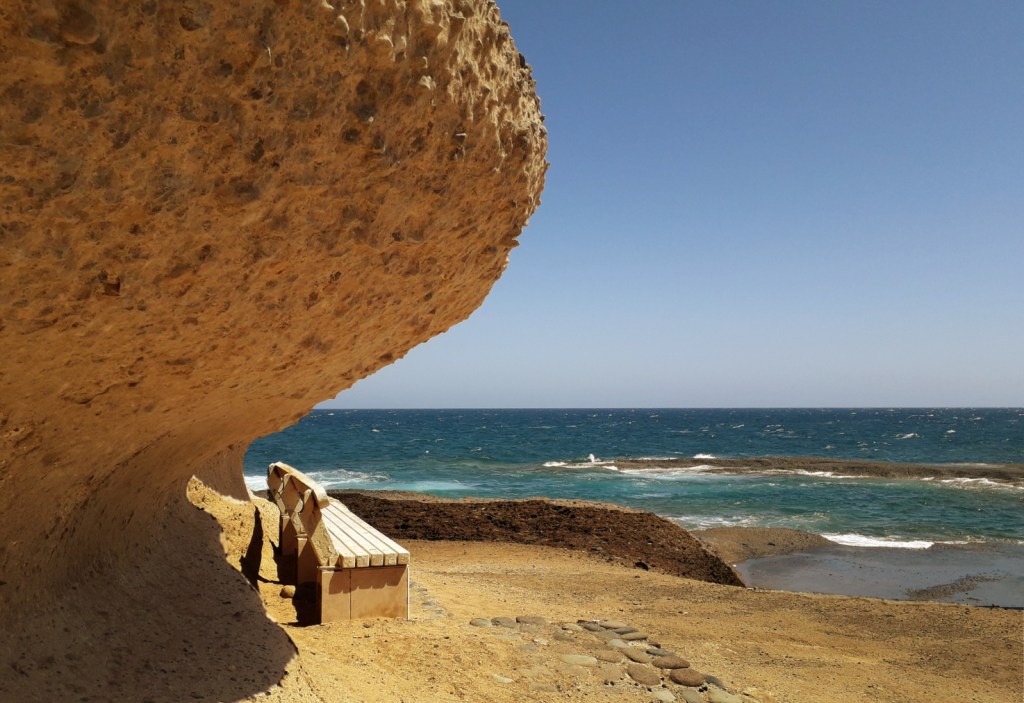 Blick aufs Meer und ein perfekter, windgeschützter Platz für den Sonnenuntergang. An der Küste bei San Miguel de Tajao.